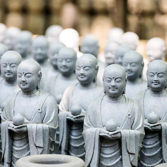 Once our train arrives in Kamakura, we will head to Hasedera (Hase Temple), home to lovely gardens and a view over the bay. Along the path to the temple’s main buildings, we’ll see hundreds of jizo, statues of the Jizo Bodhisattva, who is believed to accompany the souls of deceased children. At this point in the tour, we’ll sit for tea and traditional Japanese snacks to discuss the Jodo sect of Buddhism to which Hasedera belongs.